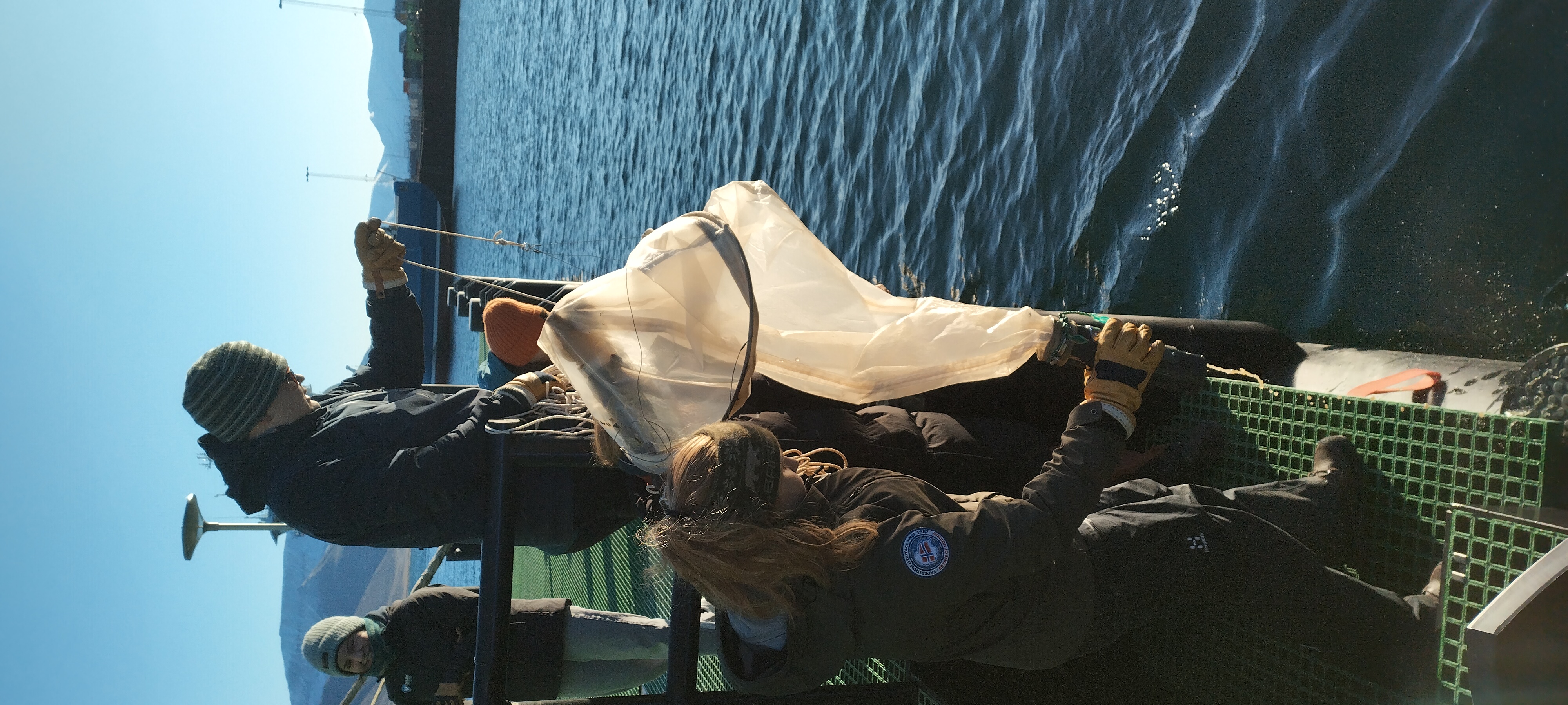 Deretter må man ta prøvene med hjelp av et planktonnett som man drar i vannet for å plukke opp plankton.